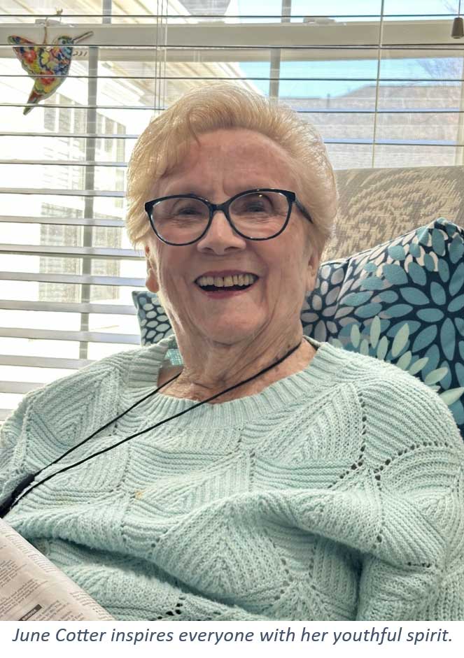 “You might not like it at first, but you do get used to it, and it is good.” June gave this honest perspective with her trademark twinkle in her eye and twitch to a corner of her lip. This 93-year-old, known as June Cotter, inspires with her youthful spirit that matches her looks (I guessed that she was in her middle 80s), helping those around her adapt to their own twists and turns in Life.